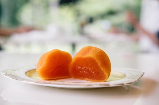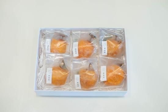 渋柿づくりの中でも【あんぽ柿】という種類で、水分量が多くゼリーのようなジューシーな食感が特徴です。乾燥させる際に硫黄燻蒸しており、綺麗なオレンジ色に仕上がります。